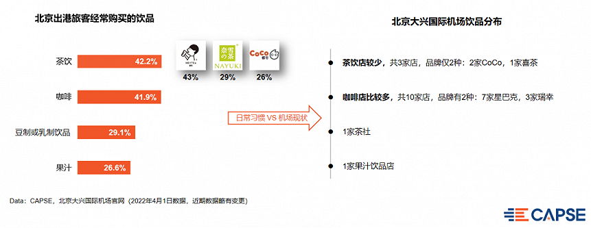 北京大兴国际机场饮品品牌大致匹配消费者主流需求。北京出港旅客对茶饮和咖啡的需求均较高,但北京大兴国际机场的茶饮店明显少于咖啡店;茶饮品牌上,北京大兴国际机场的茶饮品牌与出港旅客主流需求较一致,有喜茶和CoCo都可2种品牌,可再引进奈雪的茶;咖啡品牌上,北京大兴国际机场的咖啡品牌为星巴克和瑞幸,也是比较常见的主流咖啡品牌。