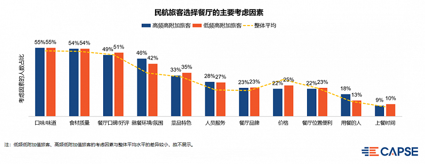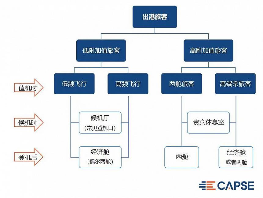 出港旅客在民航场景中的粗略识别。对于进入机场的旅客,我们可以通过旅客在乘机流程中所处的位置来粗略判断其身份特征。我们把出港旅客分为低附加值旅客和高附加值旅客:在值机时,可通过旅客的乘机舱位和会员卡等级粗略识别旅客是否为高附加值旅客;在候机时,登机口候机的旅客大部分属于低附加值旅客,贵宾休息室的旅客大部分属于高附加值旅客;在登机后,可通过旅客乘坐的舱位识别。民航高附加值旅客对就餐环境、人员服务的重视度也较高。民航高附加值旅客,在选择餐厅时也主要考虑食物的味道,食材的质量,餐厅的口碑;但是,高附加值旅客相对于整体来说,对就餐环境/氛围、人员服务的重视度也较高。