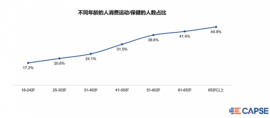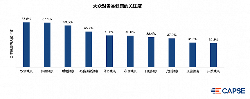 年龄越大,在运动/保健方面有消费的人群占比更高。运动/保健在大众消费中占据一席之地,反映出大众具有一定的运动/保健意识;对比来看,大龄群体在运动/保健方面有消费支出的人占比更高。大众对各类健康的关注度皆较高,对饮食、体重、睡眠的关注度是TOP3。饮食健康是大众关注的第一大健康,57.5%的人都关注饮食健康;其次,大众也重视身材形象管理,对体重健康和体态健康的关注度较高;再者,睡眠健康、心脑血管健康的关注度也较高。