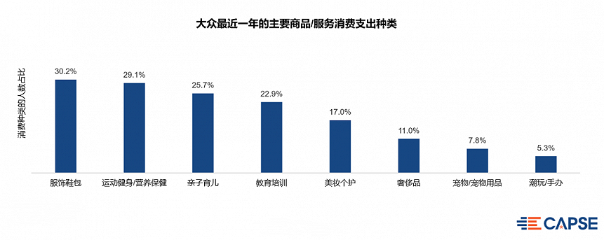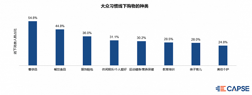 服饰鞋包、健身/保健、亲子育儿是大众消费的主要商品/服务。除了吃住保障外,服饰鞋包、健身/保健、亲子育儿是大众的三类主要商品/服务消费支出。4成消费者购物基本依赖线上渠道,45%的消费者线上和线下渠道兼用。整体来看,85%的消费者平常购物依赖线上渠道,尤其是有40%的消费者购物几乎全部依赖上线渠道。大部分消费者仍习惯在线下购买奢侈品。对于奢侈品和餐饮食品,习惯在线下购买的消费者相对较多;对于服饰鞋包、休闲娱乐/个人爱好、运动/保健、教育培训、亲子育儿、美妆个护等,大部分人习惯在线上渠道消费。