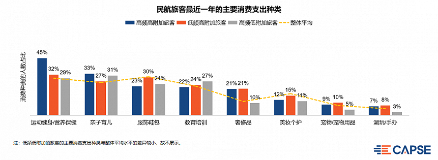 高附加值旅客对运动保健、奢侈品的需求更强。对比整体平均来看,高频高附加值旅客中,有运动保健消费支出的人数占比更高;高附加值旅客中,购买奢侈品的人数占比更高;高频低附加值旅客中,对教育培训有消费支出的人数占比更高。