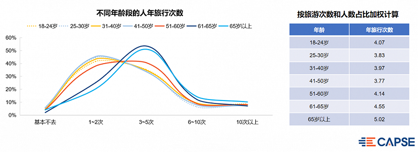 旅游旅行、休闲娱乐也是消费者的主要消费支出。近一年,约6成消费者的主要消费支出中包含旅游旅行消费;约4成消费者的主要消费支出包含休闲娱乐/个人爱好。60岁以上的消费者年均旅游4.5次以上,明显高于年轻群体平均值。50岁以下的消费者,大部分人年旅游1-2次,其次是3-5次;51-60岁的消费者,年旅游1-2次和3-5次的人占比相对较高,且两者占比相当;60岁以上的消费者,大部分年旅游3-5次,年龄越大,年旅游次数越多。