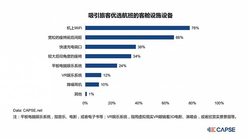 与此同时,在旅客挑选航班时所关注的客舱设施中,机上WiFi以绝对优势成为首选,数据显示:机上WiFi超越了座椅间距、充电端口等考量因素,成为了吸引旅客选择航班的首要娱乐设施。