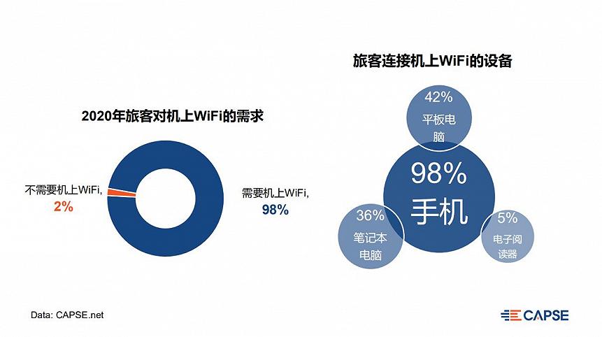 CAPSE2018年《中国航司机上WiFi趋势调研报告》的数据显示,92%的旅客需要机上WiFi,2020年旅客对机上WiFi的需求愈发强烈,有98%的旅客需要机上WiFi。另有研究表明,如果一家航空公司能提供优质的空地互联服务,67%的乘客会考虑改订这家航司的航班。