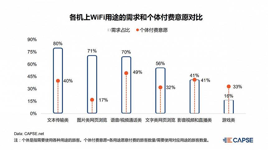 在旅客具有付费意愿的基础上,机上WiFi的哪些用途是旅客最需要的?旅客又更愿意为哪些需求付费?CAPSE数据显示:即时通讯、收发邮件等文本传输是旅客使用WiFi的最强需求,达80%;从付费意愿来看,需要语音/视频通话的旅客付费意愿最强;值得注意的是,游戏类需求虽然较低,但此类旅客的付费意愿同样较高,因此不容忽视。