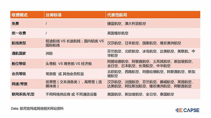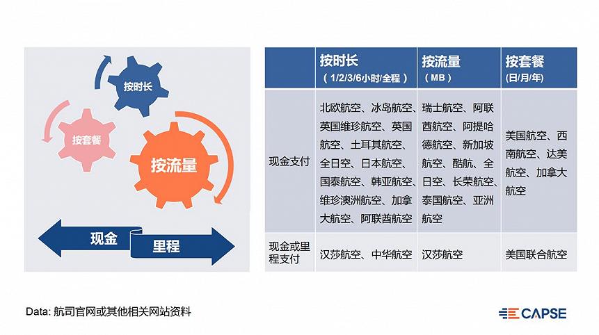 在机上WiFi服务上,国际及地区航司起步较早,发展更为成熟,美国超80%的航司已实现机上WiFi覆盖;卡塔尔航空将拥有亚洲规模最大的高速网络机队,在2020年迎来了第100架配备「超级WiFi」高速网络的飞机;汉莎航空的长途航班及中短途航班航班均已开通空中上网服务,支付方式为现金支付或会员里程兑换。目前,国际及地区航司机上WiFi多为有偿使用,且采用多种收费模式相结合的方式,机上WiFi收费标准主要有3种(时长、流量、套餐),且支持现金或里程支付。