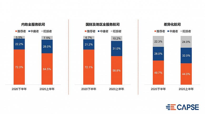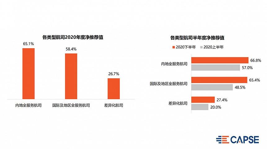 今日,CAPSE在收集58016份有效样本的基础上,发布《2020下半年航司净推荐值(NPS)报告》,数据显示:与《2020上半年航空公司净推荐值(NPS)分析报告》相比,下半年整体呈现出更多新特征:下半年,各类航司总体净推荐值较上半年均有提升,差异化航司旅客意向流失严重。