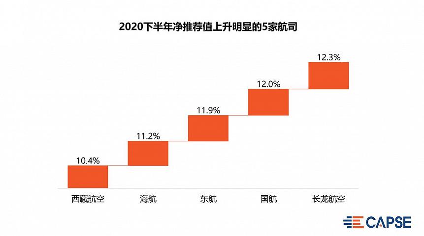 相较2020上半年,下半年浙江长龙航空、中国国际航空、中国东方航空、海南航空、西藏航空5家航司在净推荐值上进步显著,升幅均超过10%。