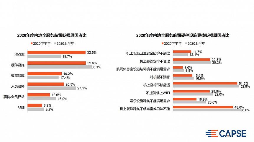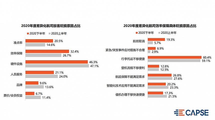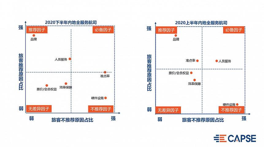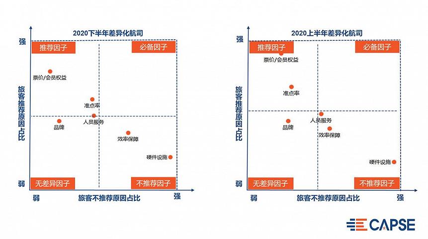 2020下半年,票价/会员权益、准点率仍是旅客推荐差异化航司的主要原因;而效率保障和硬件设施作为贬损的关键,仍是航司应努力改善的重点。