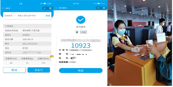 4.支付成功:旅客扫码后核对支付订单,支付成功后会显示行程、费用、值机人员工号和时间戳,出示由值机人员核对后放行行李