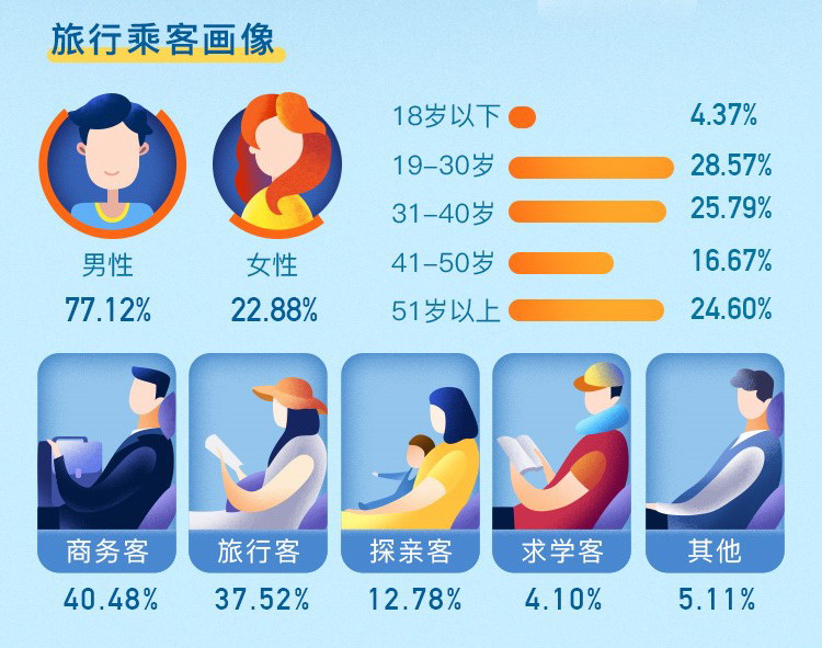 从飞行消费动机来看,商务客和旅行客占据较大比重。从消费者个体特征来看,年轻化是2018年飞行用户最重要的特点。报告通过对旅行乘客画像进行分析发现,80后、90后的千禧一代是飞机出游主力消费者。其中,19-30岁的消费者占比最大,与31-40岁消费者占比相当,18岁及以下消费者所占比例也已经达到4.37%。28.57%的旅游者来自19-30岁,4.37%是00后,合计达到32.94%,这一比例超过了31-40岁的25.97%。
