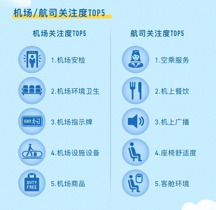 报告显示,在最受关注的航司排行榜上,东航、南航、国航、海航分列前四。在机场关注维度上,除机场安检毫无意外的占据机场关注度的榜首外,机场环境卫生、机场指示牌、机场设施设备,甚至就机场商品等元素也成为人们对机场满意度的重要指标。