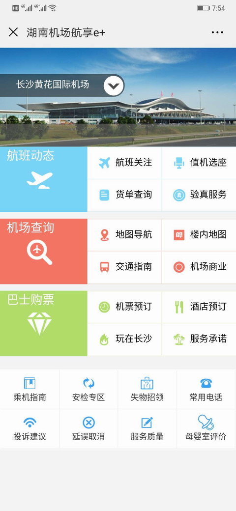 线上平台:湖南机场航享e+公众号是机场的掌上信息平台,覆盖机场集团五个机场,该公众号不但能及时为旅客推送机场最新的讯息,同时为旅客提供航班查询,微信值机,机票预定,VIP贵宾预约,大巴购票,失物招领,720度全景等全方位服务功能,是旅客出行的"贴心管家"。