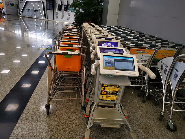 航站楼内还推出了智能手推车,在传统手推车的基础上加装了信息化屏显,具备了行李运输、航班信息查询,航站楼导航,移动充电,休闲影音、出发地目的地天气情况查询等服务功能。