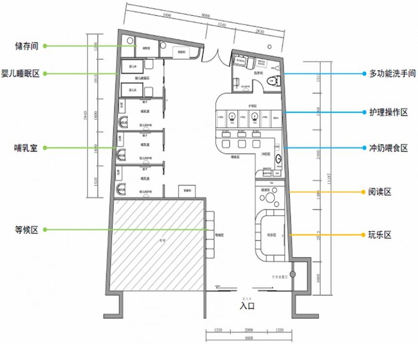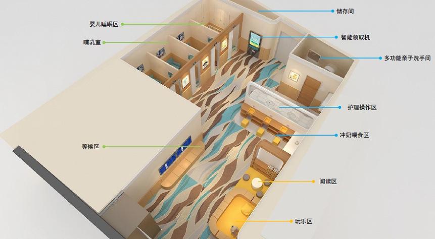 母婴室内设有儿童阅读玩乐区、冲奶区、喂食区、婴儿睡眠区、哺乳区、多功能亲子洗手间及随行家长的公共休息区等。
