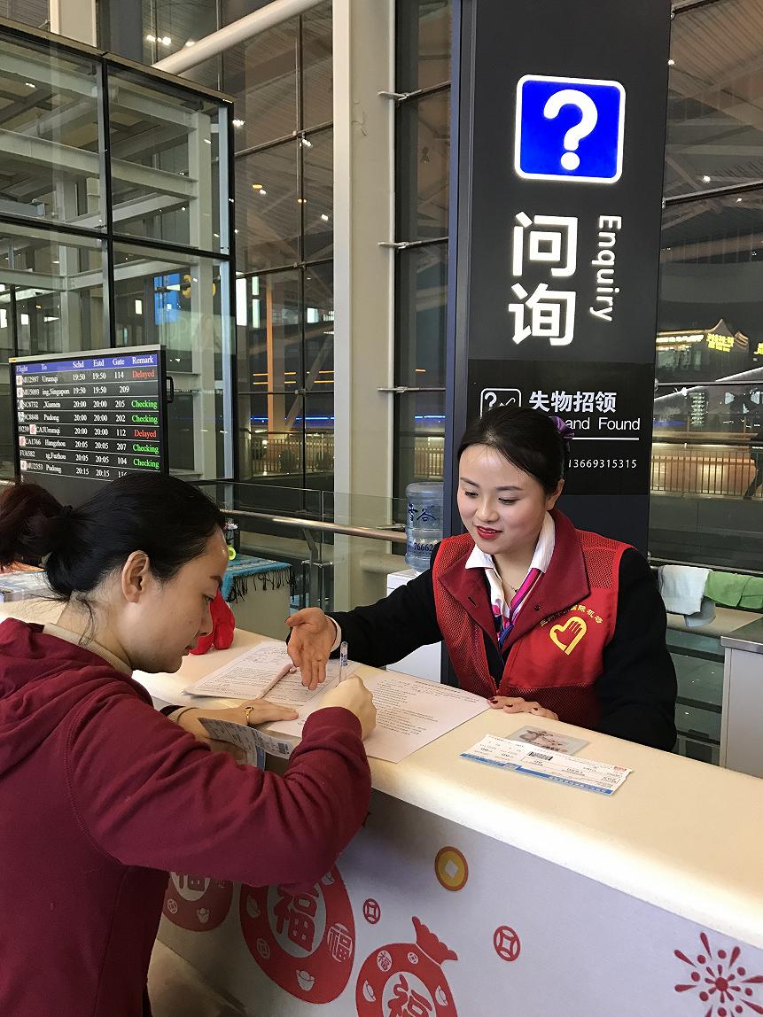 (3)手语“我帮你”指示牌:“小红帮您”班组特别在机场T1、T2航站楼问询台和综合服务柜台上分别放置了手语“我帮你”的指示牌,聋哑旅客到达机场经过柜台时可清晰地看到,方便旅客前往问询台申请办理特殊旅客服务。