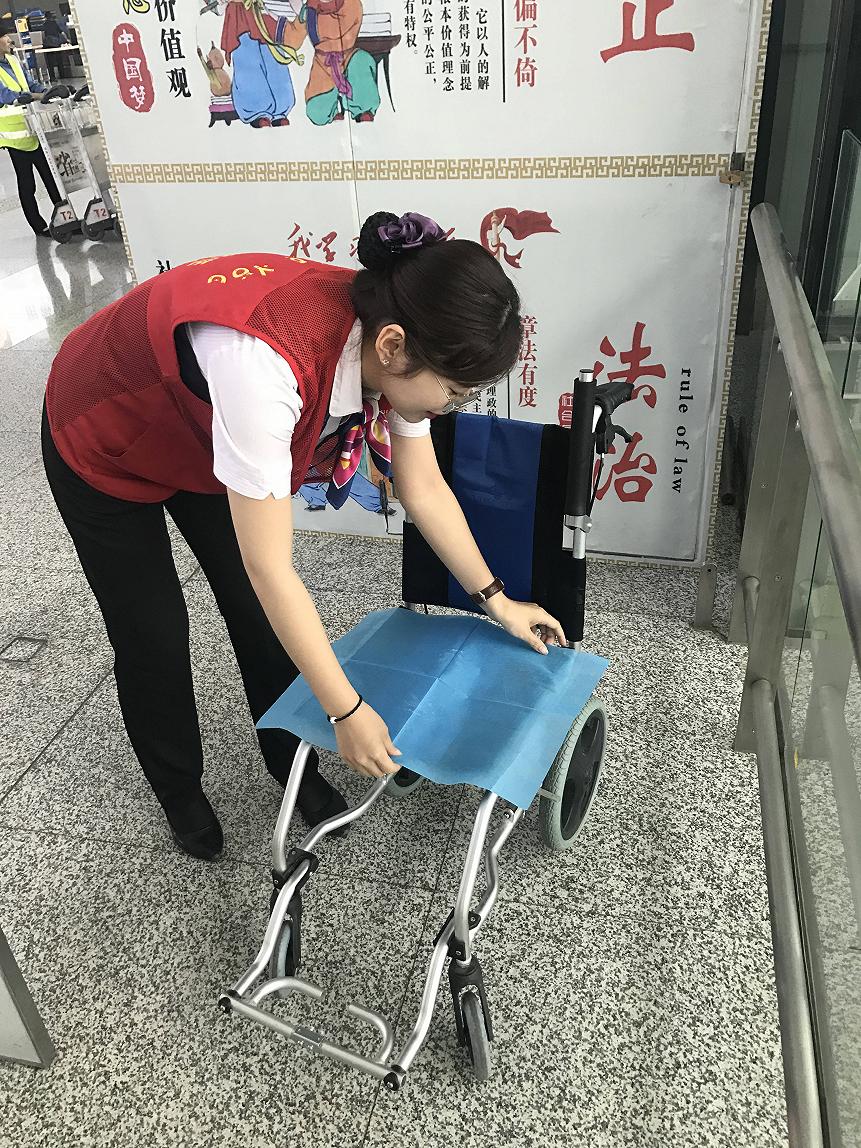 专人接待:工作人员在接收到预约信息之后,会提前为特殊旅客办理值机、填写《特殊旅客服务申请单》、准备好轮椅,安排专人前往指定地点陪护旅客顺利通过安检通道,到达登机口。