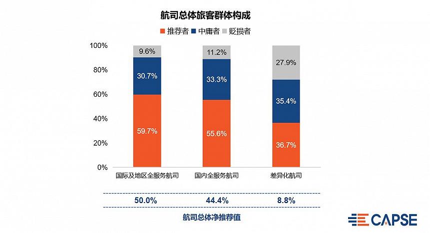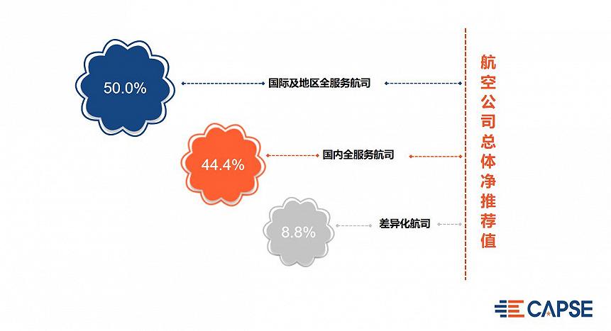 从航空公司总体净推荐值来看,国际及地区全服务航司推荐指数最高,为50.0%,国内全服务航司和差异化航司净推荐值依次为44.4%、8.8%。