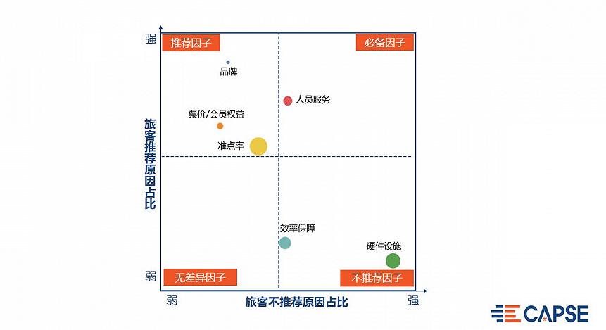人员服务对旅客普遍重要,品牌、票价/会员权益、准点率能够吸引旅客推荐,但前提是效率保障和硬件设施过关。