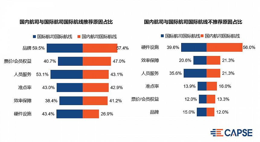 品牌、人员服务是国内航司和国际航司旅客普遍关注的点,票价/会员权益是国内航司在国际航线上与国际航司拉开距离的优势所在,硬件设施是制约国内航司比肩国际航司的主要因素。