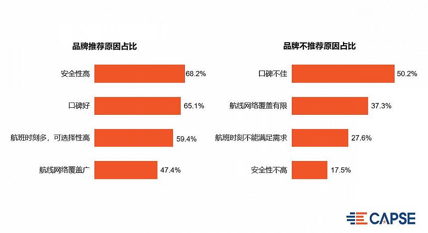 良好的口碑及丰富的航线网络是提高品牌推荐的重要因素。