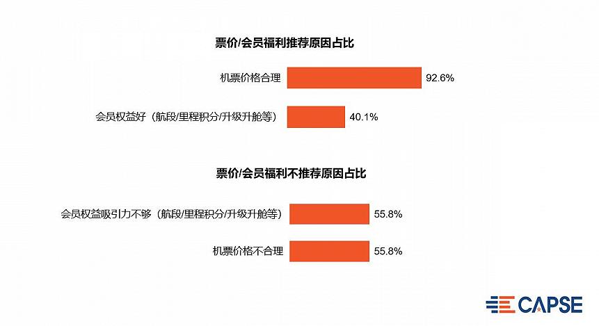机票价格合理及会员权益有吸引力是提升票价/会员权益推荐的主要因素。