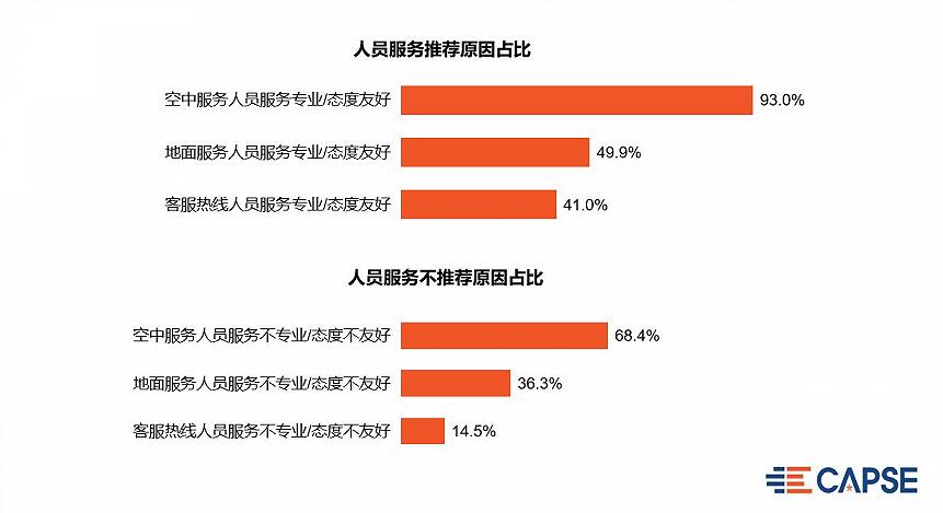 人员服务主要包括空中服务人员、客服热线人员以及地面服务人员三个方面;空中服务人员服务质量与旅客的推荐意愿息息相关,在因“人员服务”推荐的旅客中有超九成的旅客是因为服务好,在因“人员服务”不推荐的旅客中近七成的旅客是因为服务欠佳。
