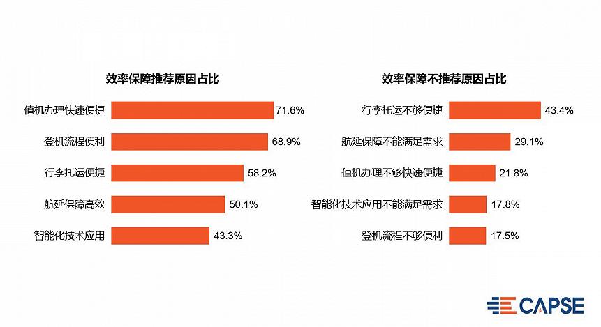 效率保障主要包括值机办理、行李托运、登机流程、航延保障以及智能化技术应用(自助值机/自助托运/行李追踪等智能化技术)五个方面;效率保障是旅客不推荐航司的主要原因之一,而行李托运不够便捷是效率保障不推荐的首要原因,因此,便捷行李托运能够有效降低因效率保障不推荐航司的旅客占比,从而完成贬损旅客到中庸旅客甚至是推荐旅客的转化,提升航司旅客忠诚度。