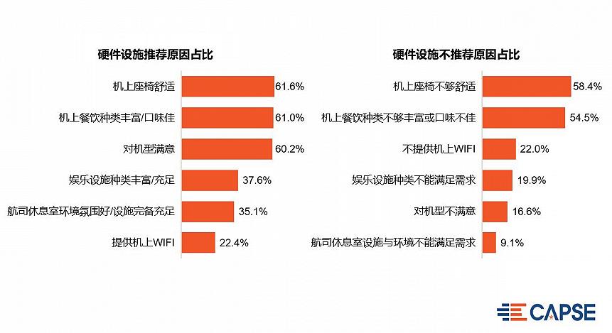 座椅舒适以及餐饮种类/口味是硬件设施影响旅客推荐与否的主要关注点。