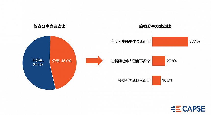 从旅客的分享意愿分析来看,将近一半的旅客有分享飞行体验的习惯,在旅客分享方式中,主动分享感受体验或留言的占比最高。