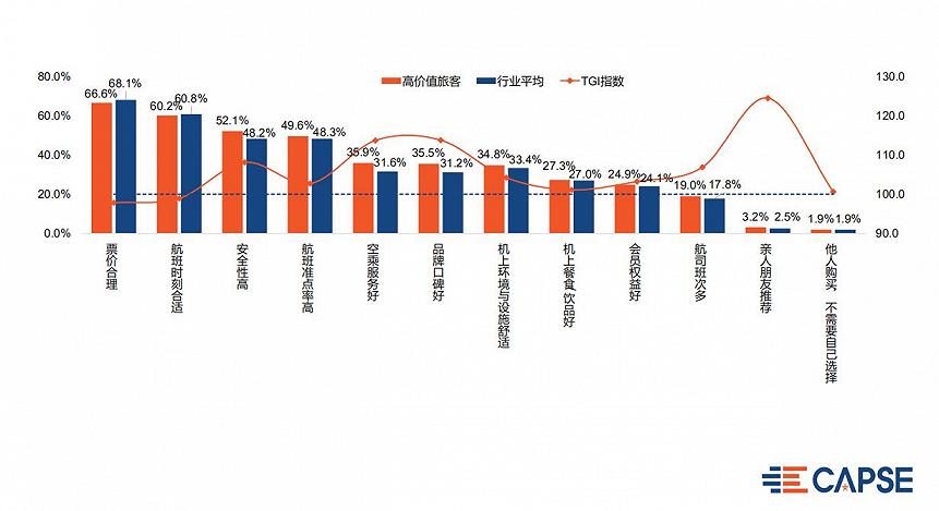 备注:TGI指数=高价值旅客对应选项占比/行业对应选项平均占比*100,如高价值旅客“亲人朋友推荐”TGI指数=高价值旅客“亲人朋友推荐”占比/“亲人朋友推荐”行业平均占比*100