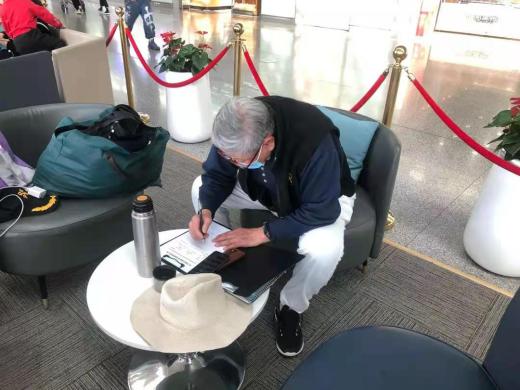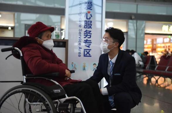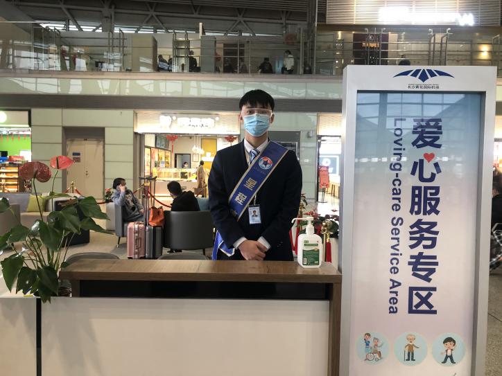 在老年人经长沙中转时,工作人员主动指引旅客前往中转休息区、隔离区内特殊旅客服务专区休息,爱心区专员协助旅客出行。