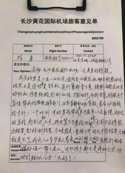 2021年2月20日,正值新春佳节,一位83岁的无陪老人在长沙黄花国际机场意见单上写下了“这些孩子都不是我的儿女,但他们胜似儿女!”这样感人肺腑的话语。这天,老人从三亚到长沙换乘至北京航班,得知需持有核酸检测报告才能入京时,因没有准备也没有家属陪同,眼看就要错过航班滞留长沙,不知所措、非常焦急,长沙机场特服员刘洋细心观察,发现了老人焦虑无助的样子,了解情况后,立马前往海航柜台协商,并与老人家属电话沟通,获得家属允许后全程陪同老人从长沙机场前往长沙县第一人民医院做核酸检测报告,近30公里的车程,刘洋像对待自己父亲一样细心照顾安抚,逗老人开心,到达医院跑前跑后帮助老人办手续、测核酸、拿报告,以最快速度帮助老人改签、办理乘机手续,当日顺利乘机抵达北京。刘洋全程关爱陪伴老人、特殊需求响应服务,贴心暖心感动人心,用实际行动履行“一对一关爱陪伴,特殊旅客乐湘伴”的承诺,传播真情服务,让老人一路星程,乐在其中。