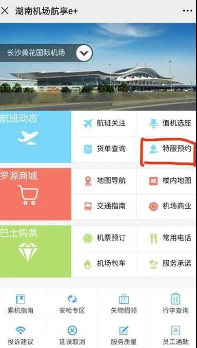 1、微信服务号预约:在微信公众号搜索“湖南机场航享e+”公众号,点击“机场首页”中的“特服预约”,特殊旅客可通过线上预约服务。(特殊旅客范围及服务流程详情可参考公众号中“爱心服务”流程)。