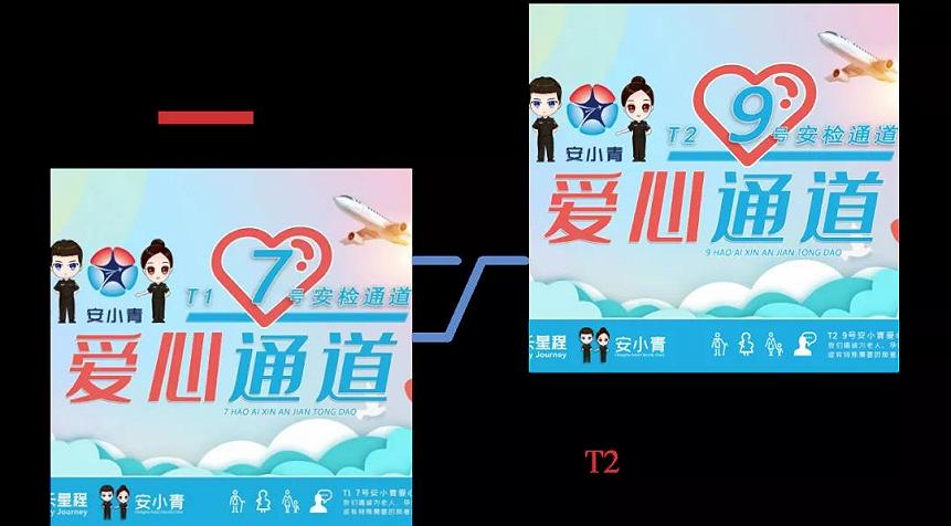 T1-7号通道;T2-9号通道。为老年旅客提供热情细致的便捷过检服务。