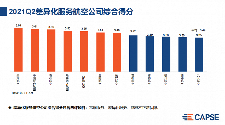 差异化服务航空公司综合得分中,2021年第二季度测评平均分为3.49分,天津航空、中国联合航空、春秋航空、乌鲁木齐航空、北部湾航空分居前五。
