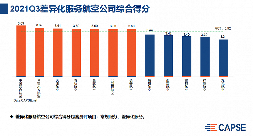 差异化服务航空公司综合得分中,2021年第三季度测评平均分为3.52分,中国联合航空、乌鲁木齐航空、天津航空、春秋航空、金鹏航空分居前五。