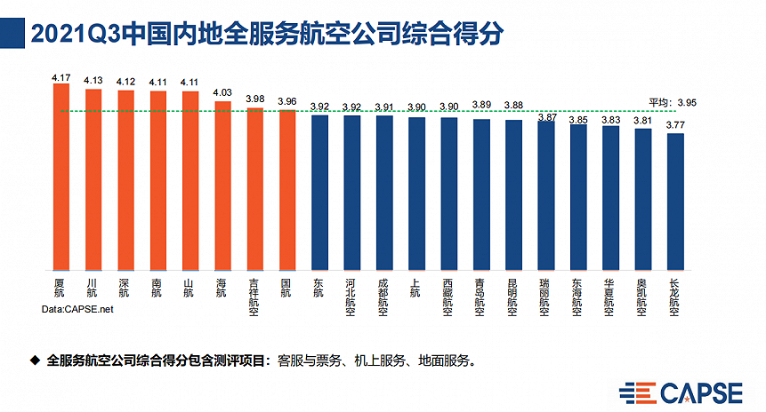 特别说明:因COVID-19影响,2021Q3“航班不正常保障”及其明细指标未计入航司测评项目,故综合得分涵盖空乘服务、机上广播、机上餐饮、客舱设施与环境、机上娱乐、值机与离港、行李服务、客服与票务8大项。