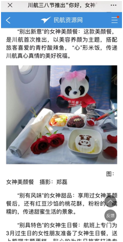 川航坚持体现时下流行元素,节日期间营造节庆氛围,打造川航特色节日餐食,“女性餐”、“妈妈餐”、“儿童餐”应运而生,在不同的节日为旅客送上浓浓的祝福。三八节期间,以粉色为辅色调,创新推出“川航女性餐”,真正做到为“她”贴心考虑,关注和挖掘服务过程中的女性诉求,致力于给女性旅客带来美好的出行乘机体验。