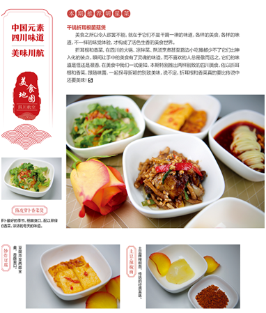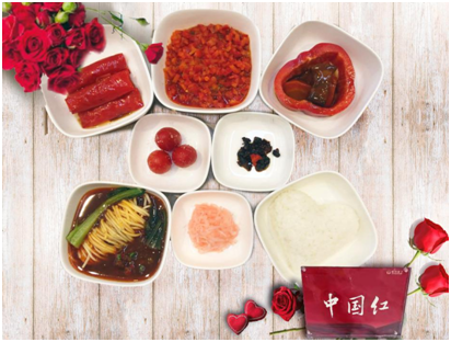 习近平总书记多次强调“用好红色资源,传承好红色基因”。四川鲜香麻辣的美食、热情好客的风俗、源远流长的历史都与红色息息相关,为弘扬红色文化,川航将服务人民的初心铭记于心,把乘务员热情好客的淳朴性格融入四川特色的“红色”美食,带给每一位旅客,创新推出”中国红”红色餐食,严格食材挑选,整盘端出,映入旅客眼帘的所有菜品均呈现为红色,第一眼惊艳、再一口留香。