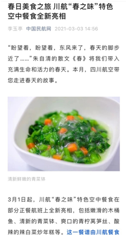 “直播”、“云会议”等新媒体手段应用,多样化多渠道创新问题解决方案,有效提升餐食品质,并确保了颜色餐食在全航线、全航食顺利推广。通过全流程餐食质量管理体系建设,川航也将颜色餐食打造为可借鉴、可推广的机上餐食创新产品,进一步提升旅客对机上服务的满意感、幸福感和获得感。