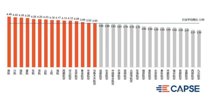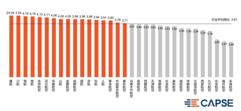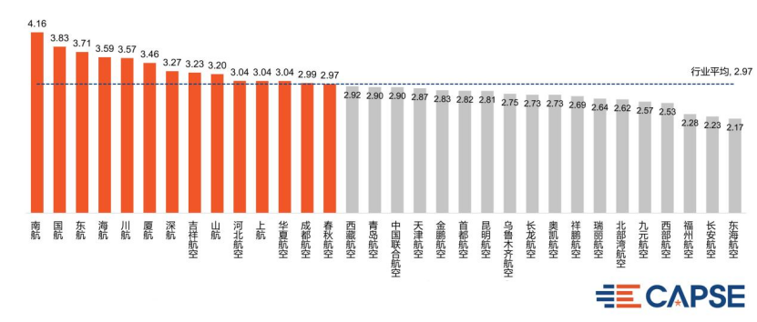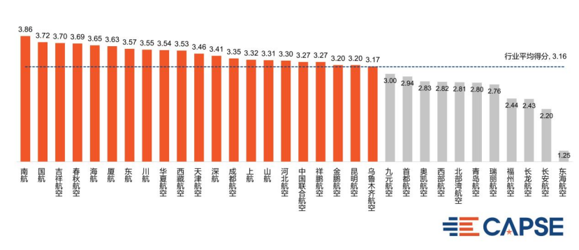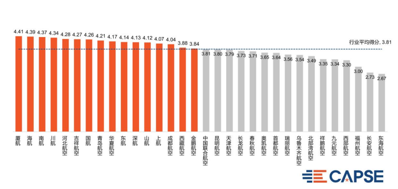本次测评中国民航服务品牌评价平均分为2.97分,32家入选航司中,18家航司服务品牌低于平均水平;仅南航综合得分超过4分,综合得分排名第一,与二三名分差较大。