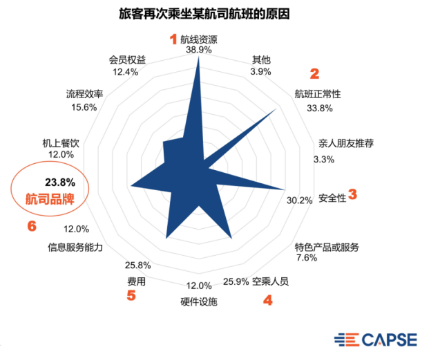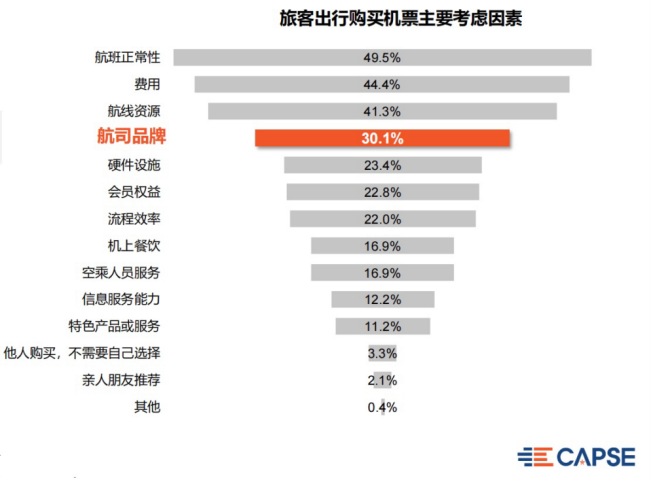 本次测评选取32家航空公司公布航司服务品牌评价结果,报告显示:超1/3民航旅客出行选择航班时会考虑航司品牌,具有品牌偏好倾向;成熟旅客在出行购票时更注重航司品牌;航司品牌建设可以撬动旅客复购,提升旅客选择该航司航班的频率。