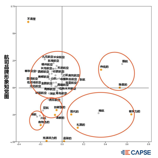 品牌形象感知方面,超8成航司在旅客心中形象感知趋同,国航、南航、厦航、川航、海航、吉祥航空品牌形象具有鲜明的差异。如,国航是最“稳重的”、“传统的”、厦航、吉祥航空是最“创新的”、“清新的”等。