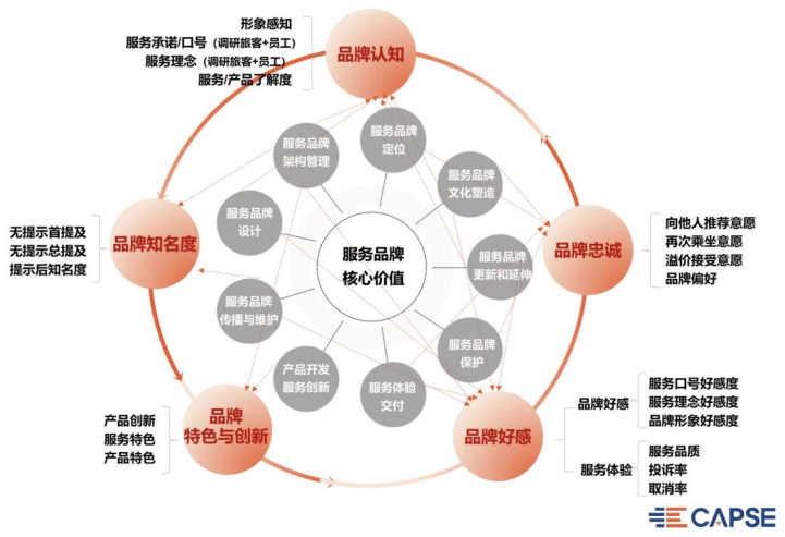 为了深入研究中国民航服务品牌价值,协助中国民航推进“十四五”航空运输旅客服务专项规划,打造闭环式服务。CAPSE基于对各主流品牌理论成果的研究,融合自身强大的数据优势,及在民航服务领域的多年研究沉淀,整合梳理出中国民航服务品牌核心价值9大板块,进而延伸出可度量的民航服务品牌评价指标体系的5类一级指标及对应二级指标维度。