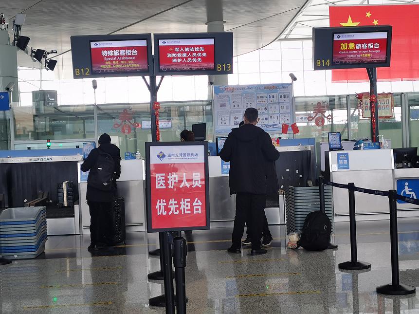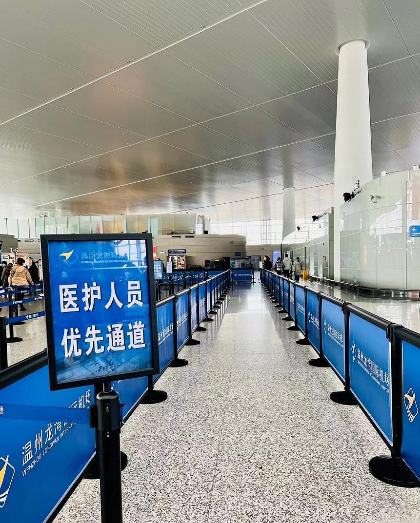 为表达对广大医护工作者最诚挚的感谢和最崇高的敬意,温州机场在春运之初增设“医护人员”专用通道,为医护人员提供更加便捷、贴心的出行服务。医护人员可凭本人身份证原件及《医师执业证》或《护士执业证》在温州机场享受优先值机、优先安检及优先登机服务。