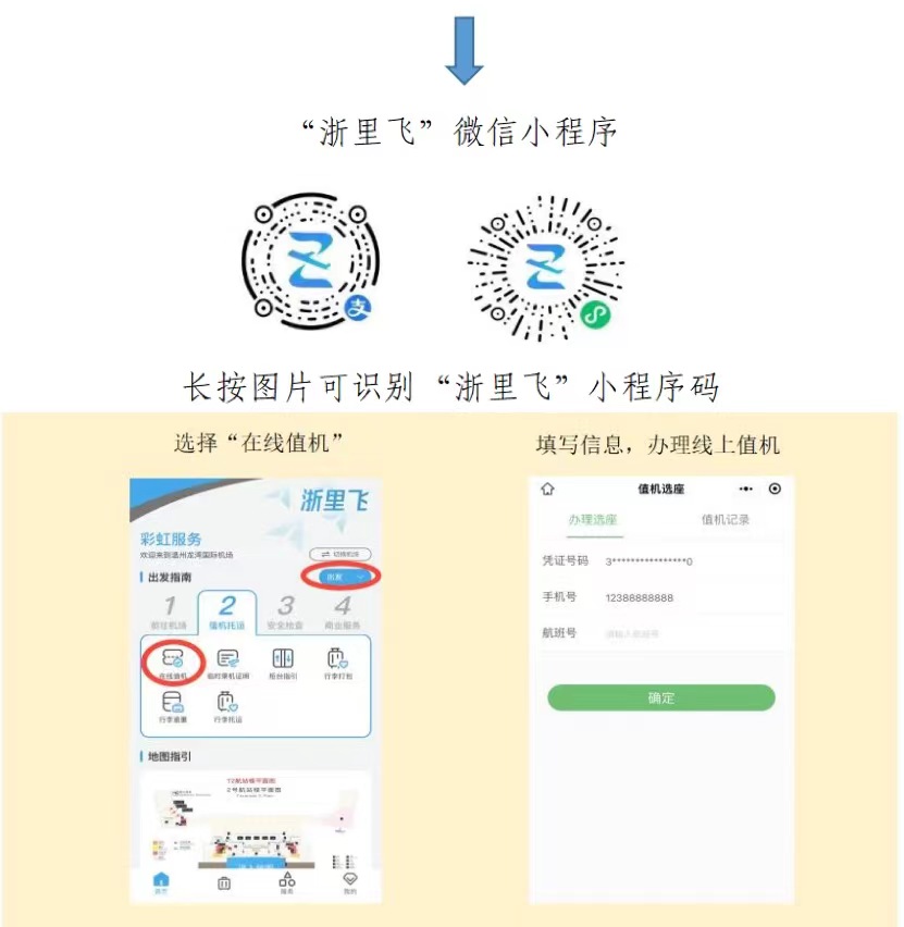 第一步:办理电子登机牌,打开手机搜索“浙里飞”,选择微信小程序“浙江省机场集团浙里飞服务平台”或者扫描下方“浙里飞”二维码。