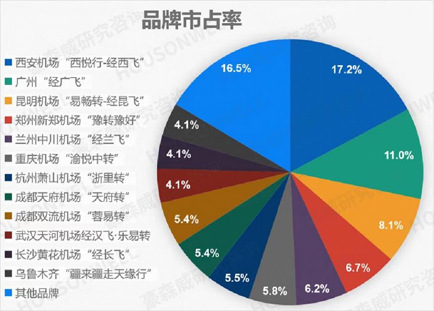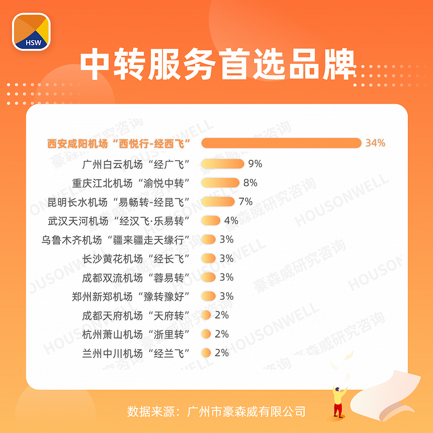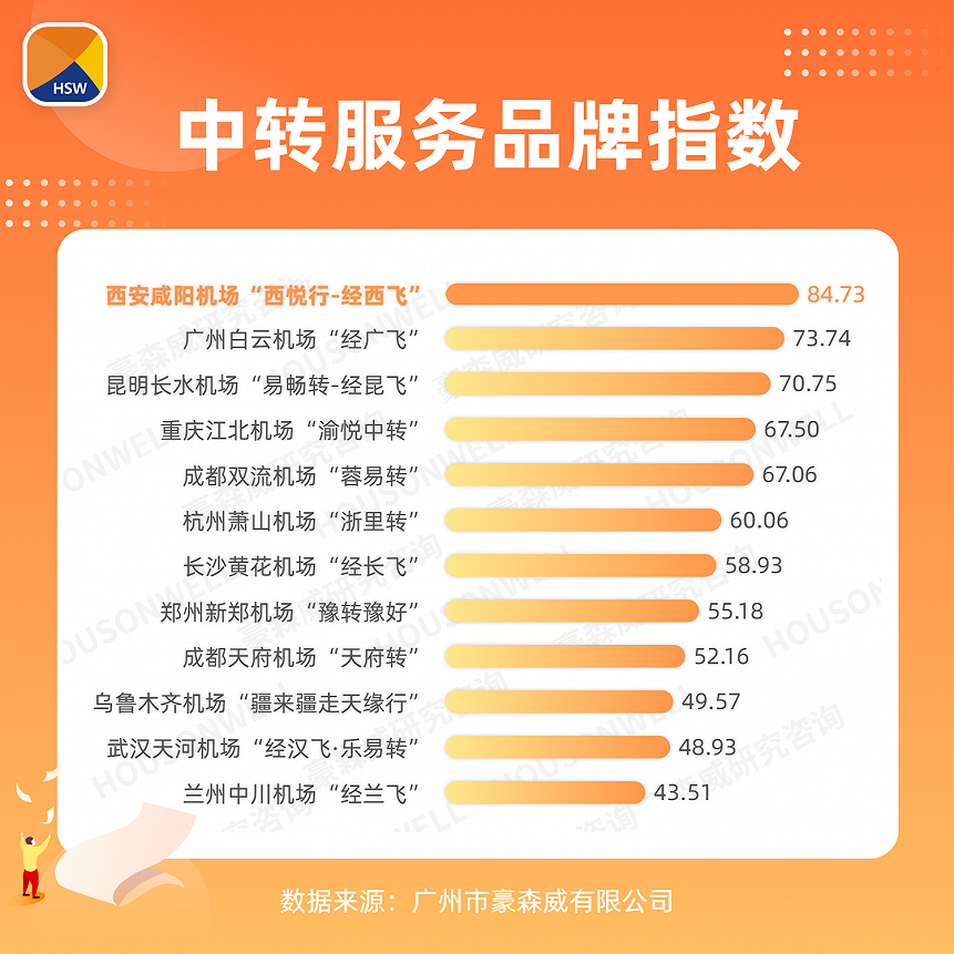 中转品牌指数是从消费者态度层面综合评价中转品牌发展状况,排名前五依次为:西安咸阳机场“西悦行-经西飞”、广州白云机场“经广飞”、昆明长水机场“易畅转-经昆飞”、重庆江北机场“渝悦中转”、成都双流机场“蓉易转”。