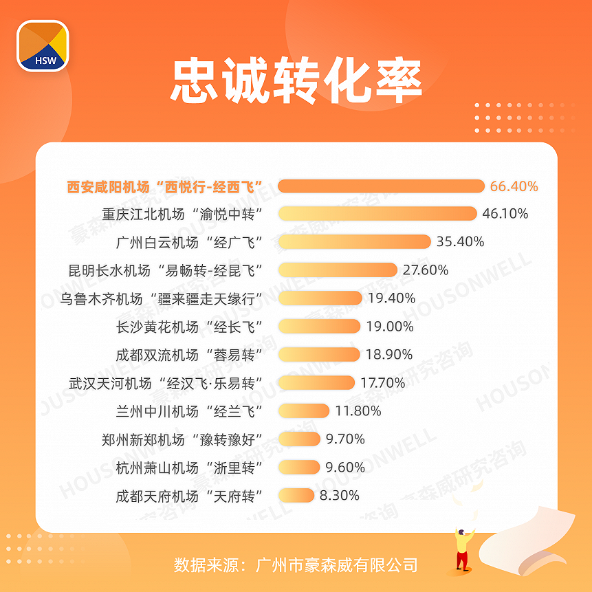 2022年12月,豪森威开展全国机场中转品牌专题研究,以ADP模型、品牌指数模型、品牌构成模型等为理论基础,建立了中转品牌综合评价方法体系,从品牌指数、市场占有率、首选率、忠诚转化率等维度对国内12个机场中转品牌的发展现状进行评价。