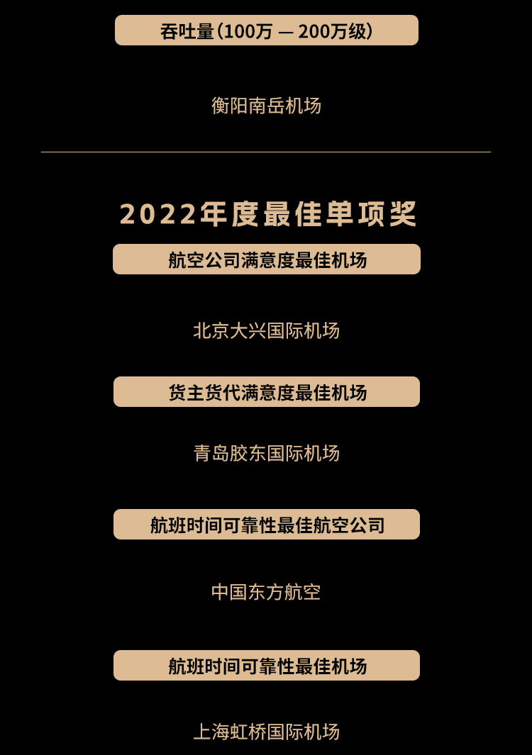 同时,本次航空服务奖增设【航空公司满意度最佳千万级机场】、【货主货代满意度最佳千万级机场】、【航班时间可靠性最佳机场】、【航班时间可靠性最佳航空公司】4大奖项,其中【航班时间可靠性最佳机场】是指机场运营的航空公司第一次销售机票给旅客的计划起飞时间与实际起飞时间差值小于30分钟的实际执飞航班占比最高的机场;【航班时间可靠性最佳航空公司】是指航空公司第一次销售机票给旅客的计划起飞时间与实际起飞时间差值小于30分钟的实际执飞航班占比最高的航空公司。